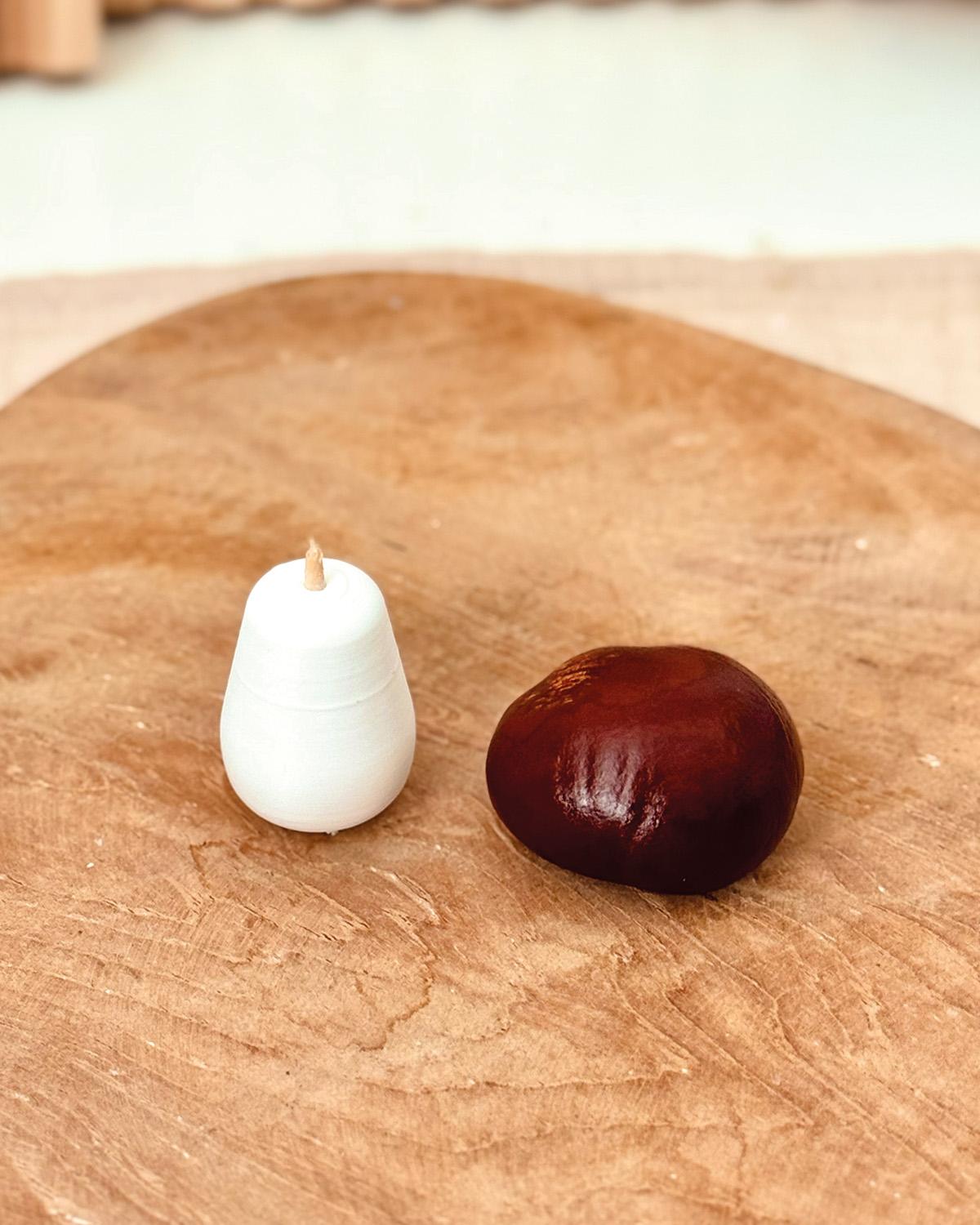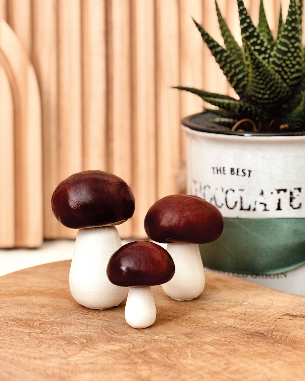 Mit dieser 3D-Druckdatei erhältst du praktische Pilzstiele, die sich wunderbar mit Naturmaterialien kombinieren lassen. In die Stiele ist ein kleines Loch integriert, in das du einen Zahnstocher steckst. So kannst du Kastanien, Eicheln oder andere Naturfundstücke als „Pilzhut“ aufsetzen und im Handumdrehen zauberhafte Pilze basteln.