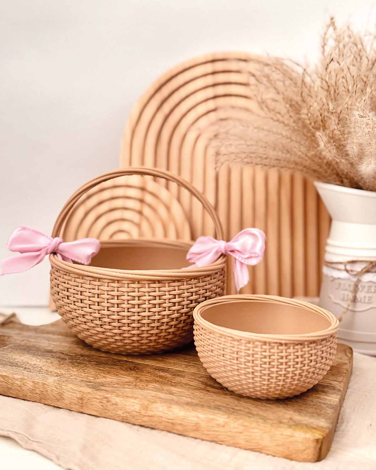 Eine Version mit Henkel für den typischen Korbcharakter und eine schlichte Variante ohne Henkel, die sich hervorragend als kleine Schale oder Tischdeko einsetzen lässt.