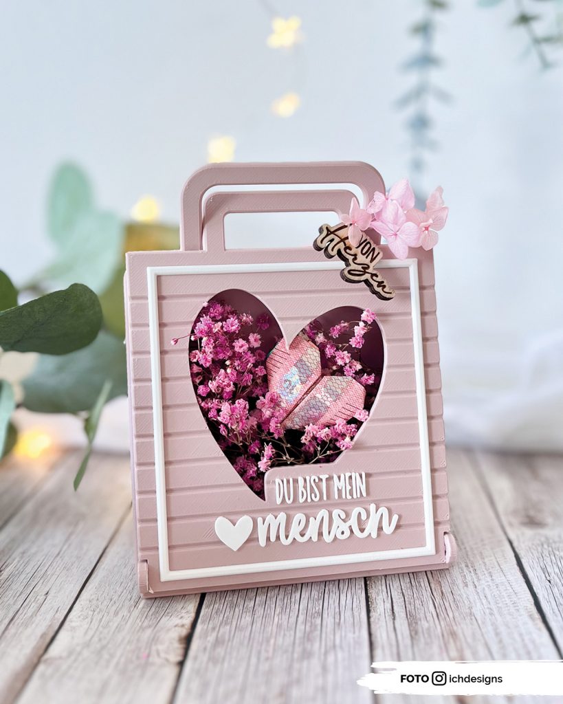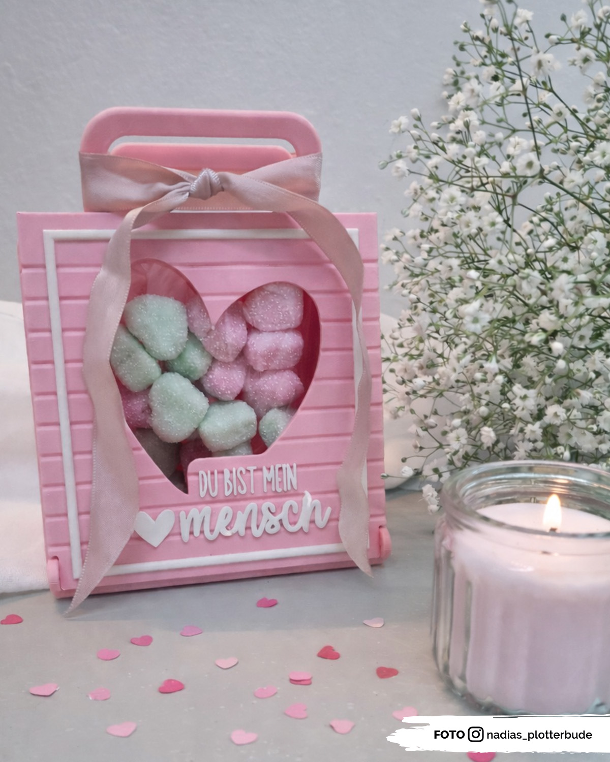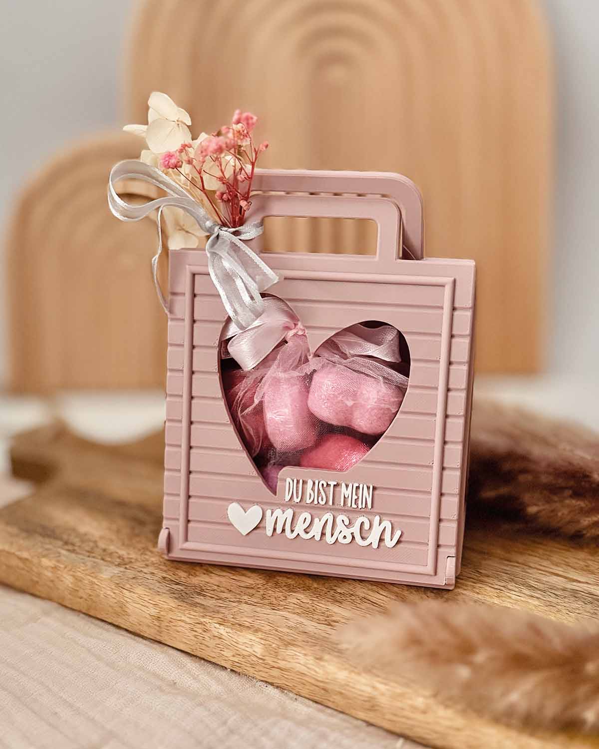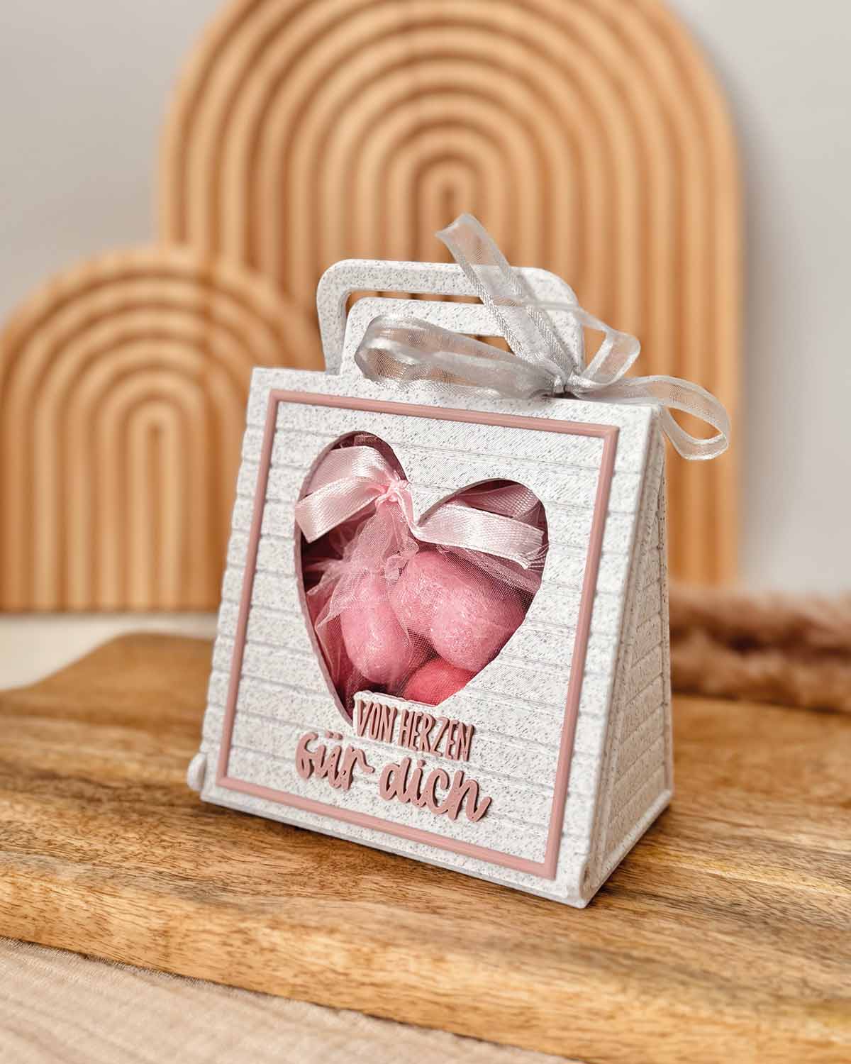 Die Geschenktasche kannst du dann mit wechselbaren Fronten und Rückseiten für verschiedene Anlässe ausstatten. Für das Herzens-Thema stehen dir zwei Design zur Verfügung: „Du bis mein Herz-Mensch“ und „Von Herzen für dich“. Durch die Aussparung in der Front bleibt der Inhalt sichtbar – ideal für Süßigkeiten, Beauty-Produkte oder andere Kleinigkeiten.