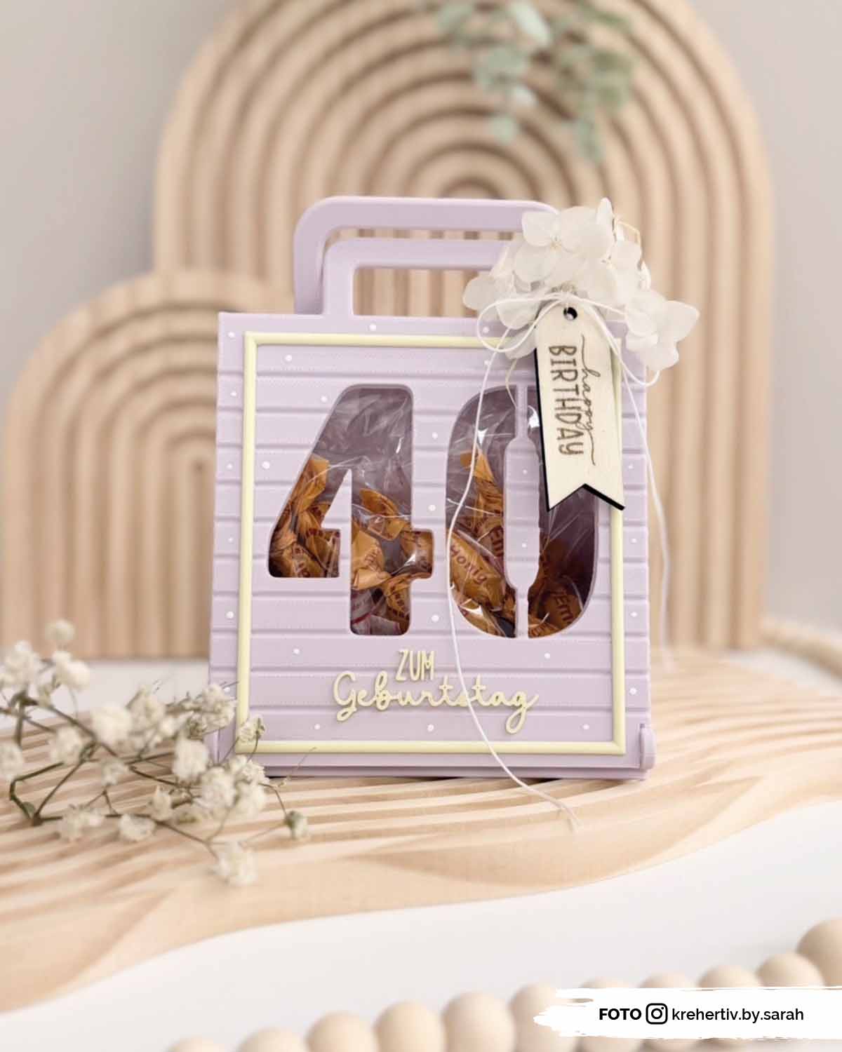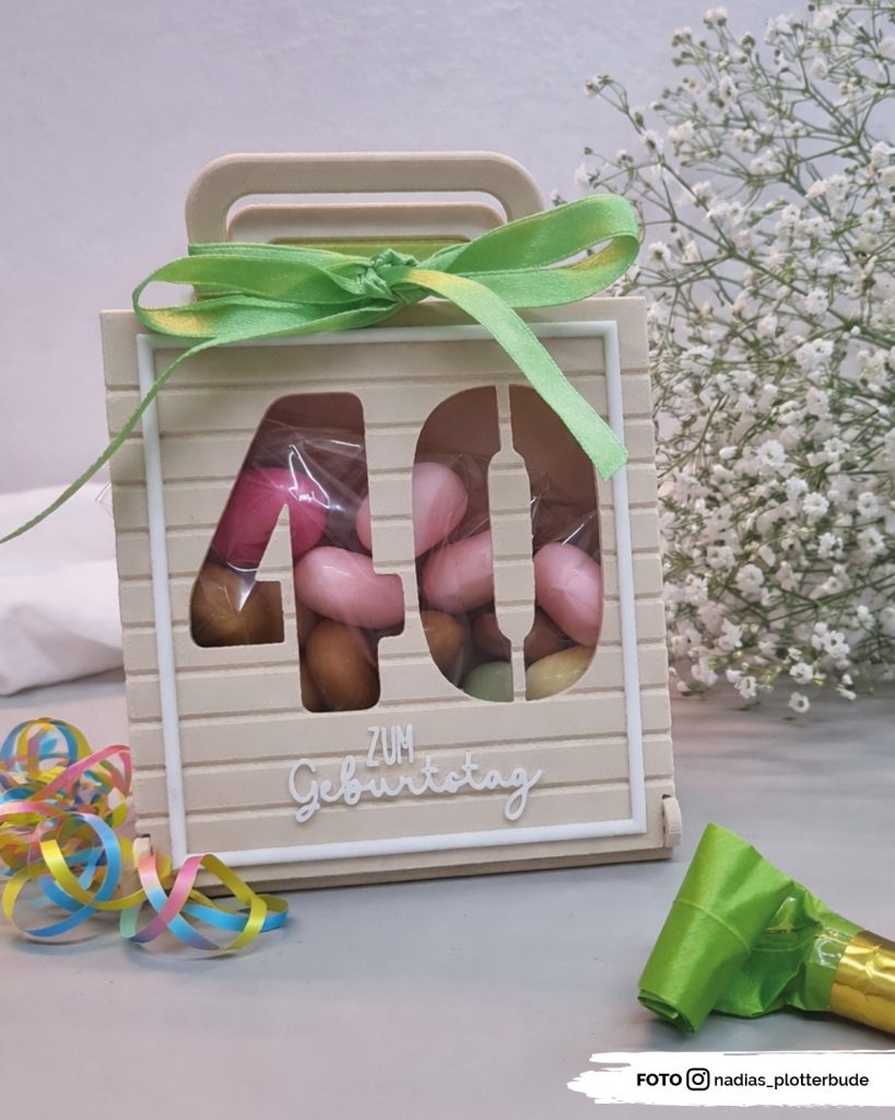 Die Geschenktasche kannst diesen dann mit wechselbaren Fronten und Rückseiten für verschiedene Anlässe ausstatten. Für das Thema Geburtstag stehen dir unterschiedliche Design zur Verfügung: Zahlen für runde Geburtstage oder den 18. Geburtstag sowie neutrale Motive wie eine Blume oder ein Törtchen. Durch die Aussparung in der Front bleibt der Inhalt sichtbar – ideal für Süßigkeiten, Beauty-Produkte oder andere Kleinigkeiten.
