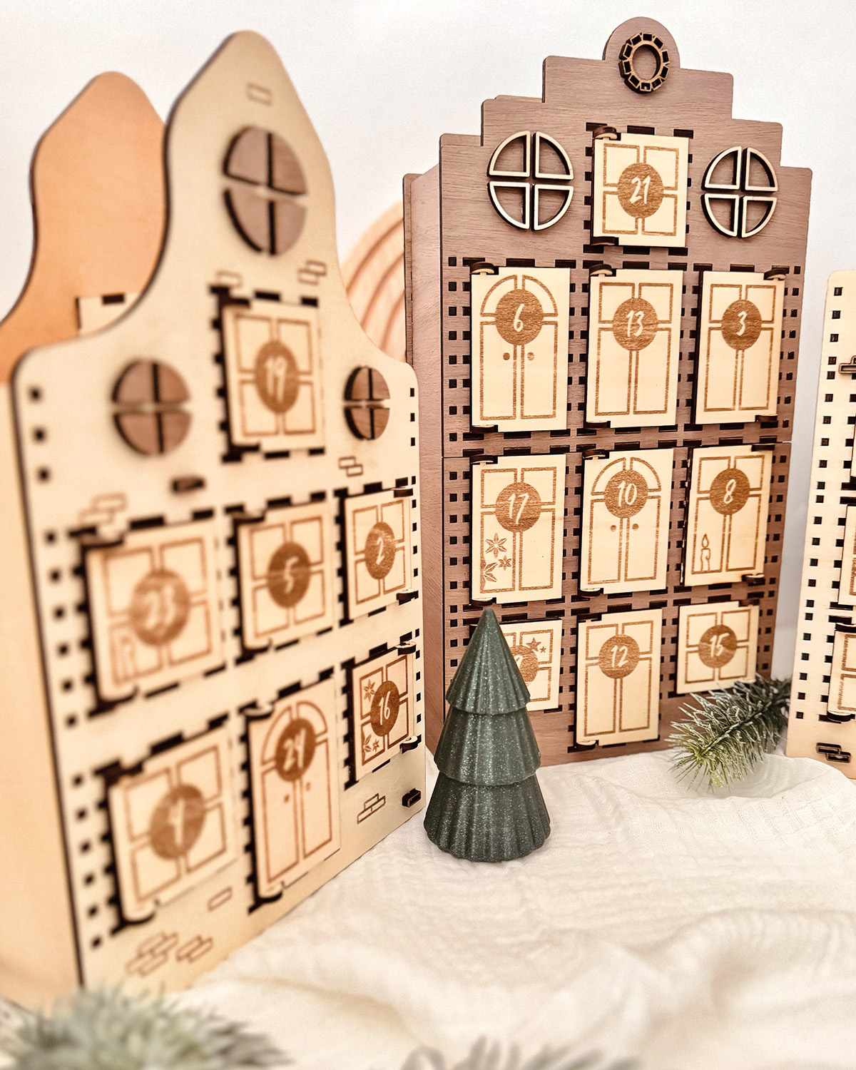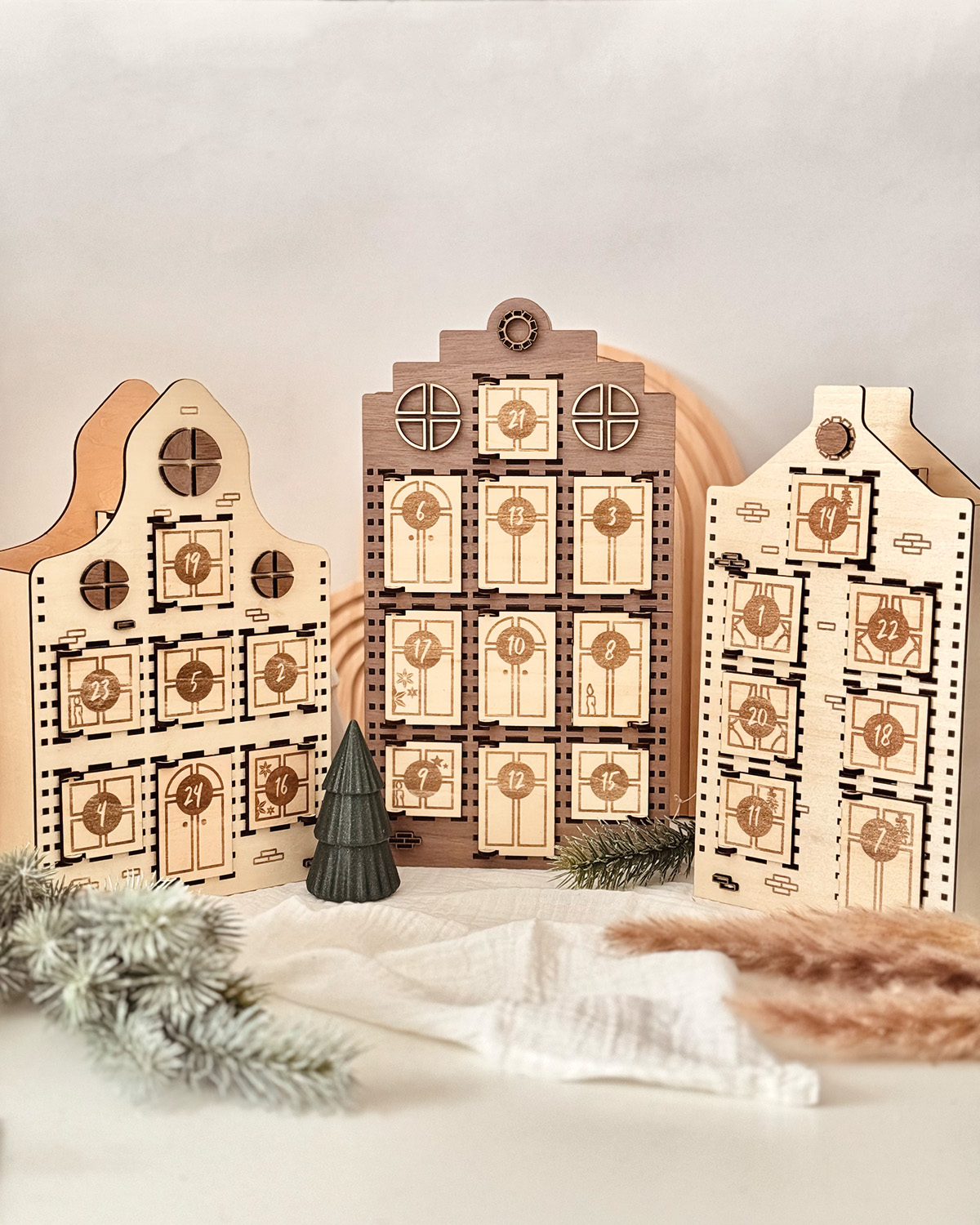 ✔ Detailreiche Laserdatei (SVG) – für einen Adventskalender aus drei Grachtenhäuschen