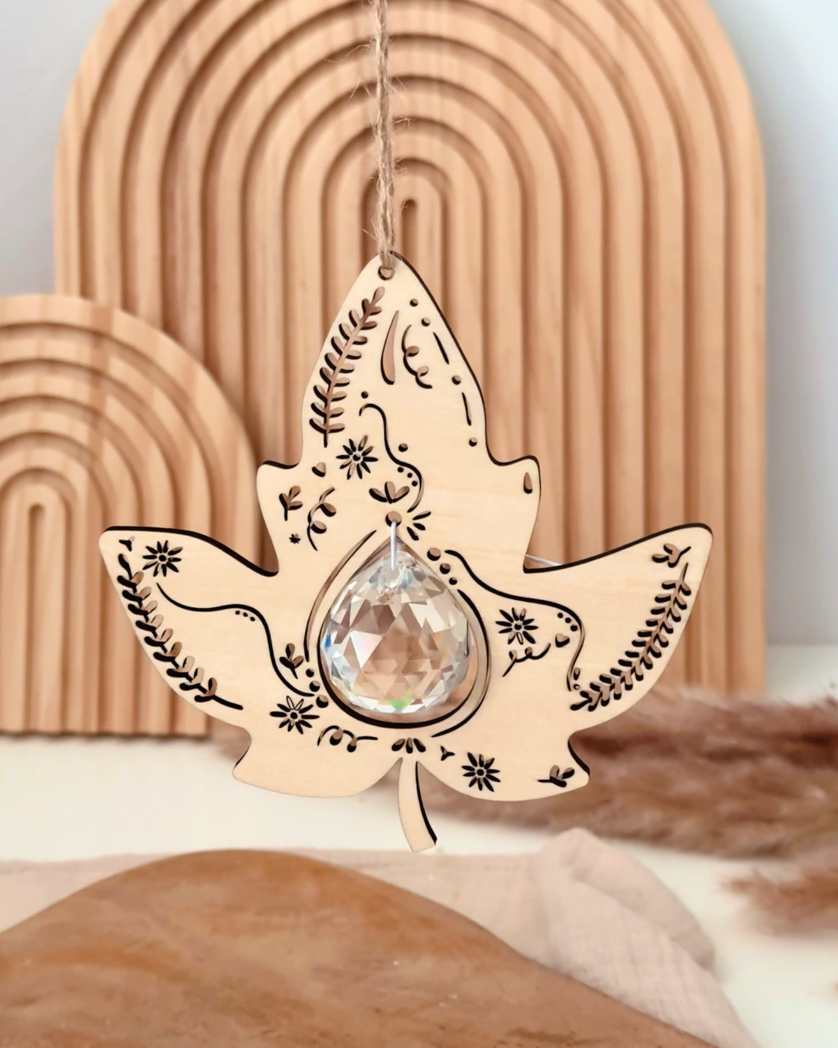 Mit diesem filigranen Sonnenfänger in Blattform fängst du das Licht auf besonders schöne Weise ein. Das detailreiche Ornament-Muster kann graviert oder geschnitten werden und bildet einen eleganten Rahmen für den funkelnden Kristall in der Mitte. Besonders gut eignet sich ein tropfenförmiger Sonnenfänger mit einer Höhe von bis zu 4 cm, der das Sonnenlicht in kleine Regenbögen verwandelt.
