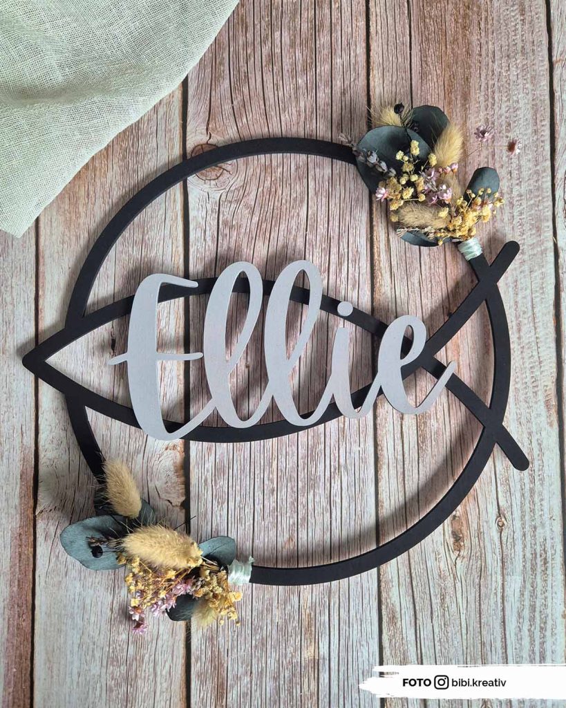 Diese Laserdatei zeigt einen schlichten, modernen Kranz mit einem zentralen Fischmotiv – perfekt für christliche Feste wie Kommunion, Taufe oder Konfirmation. Der Kranz kann nach Belieben personalisiert oder kreativ mit Trockenblumen gestaltet werden und bietet dir so eine wunderschöne Möglichkeit, deine Deko individuell zu gestalten.