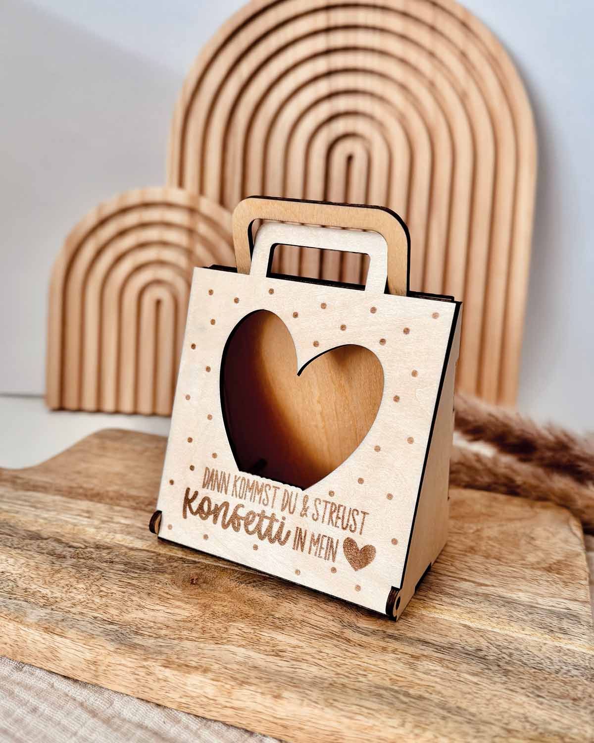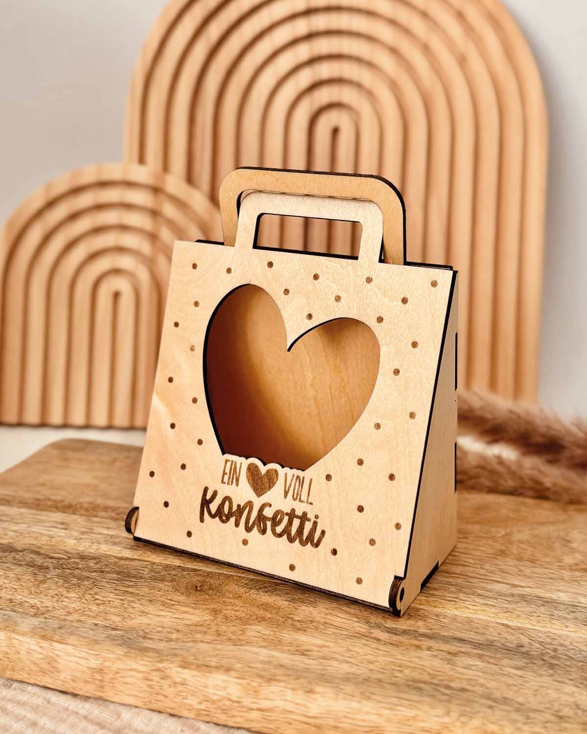 Die Geschenktasche kannst du dann mit wechselbaren Fronten und Rückseiten für verschiedene Anlässe ausstatten. Für das Herzens-Thema stehen dir zwei Design zur Verfügung: „Ein Herz voll Konfetti“ und „Dann kommst du und streust Konfetti in mein Herz“ und „Karneval Survival Kit“. Durch die Aussparung in der Front bleibt der Inhalt sichtbar – ideal für Süßigkeiten, Beauty-Produkte oder andere Kleinigkeiten.