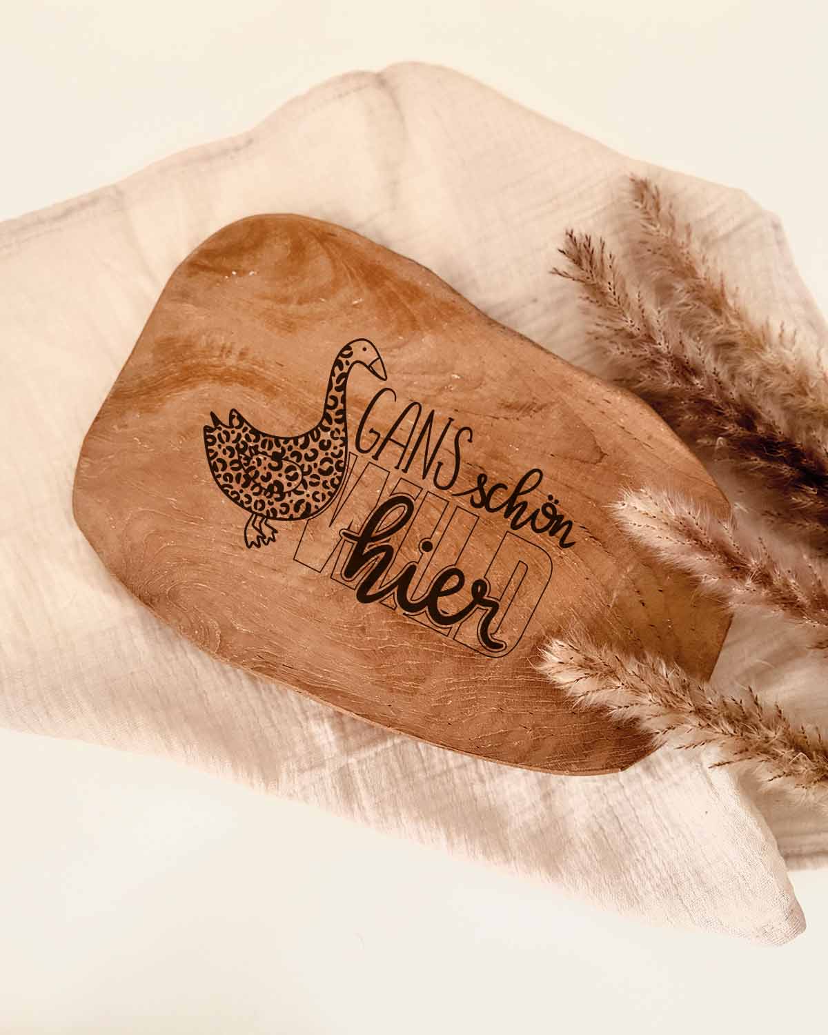 Diese Laserdatei verbindet Humor, Wortspiel und modernes Design zu einem GANS besonderen Deko-Statement. Der Schriftzug „GANS schön wild hier“ wird durch die handgezeichnete Gans mit Leopardenmuster ergänzt.