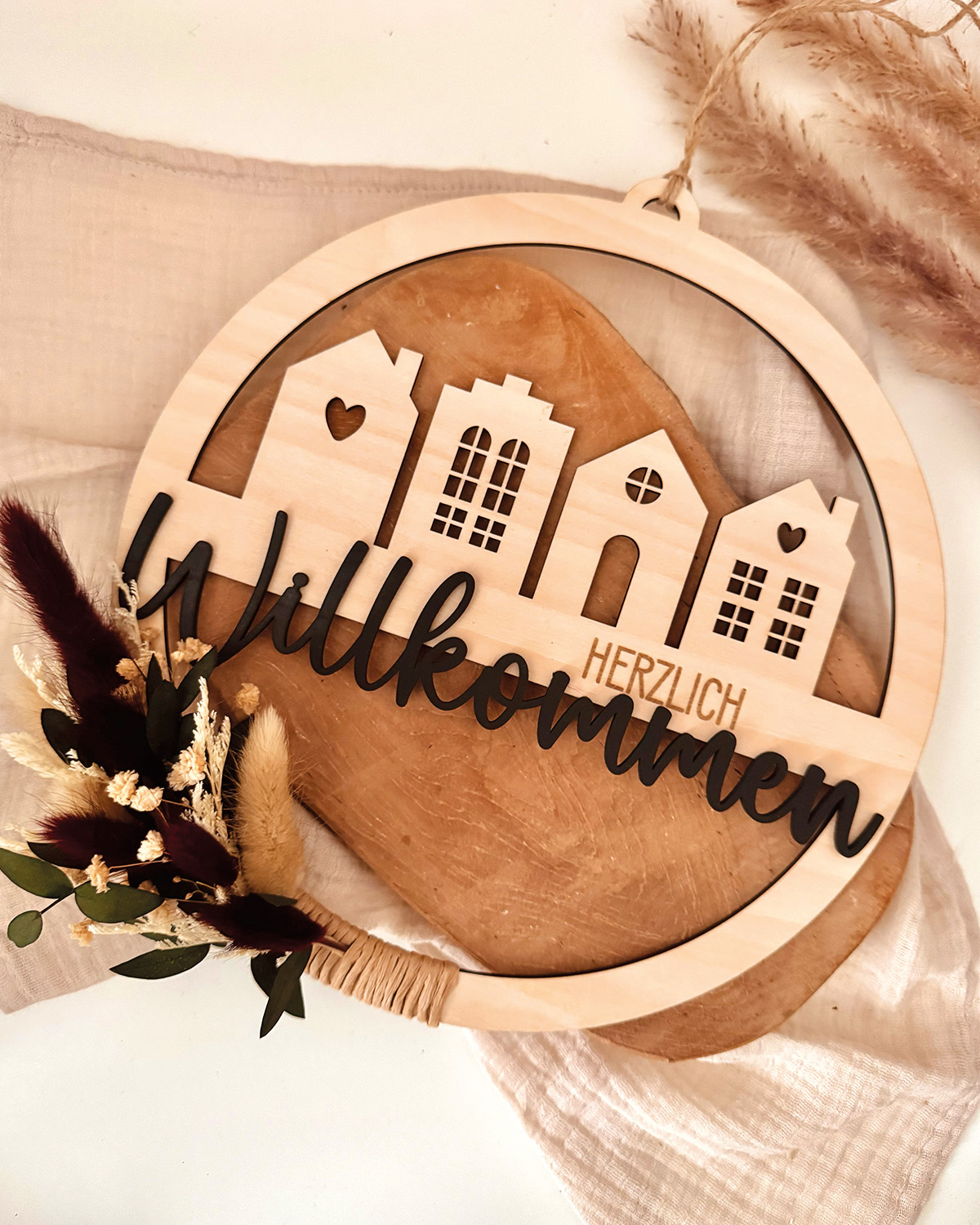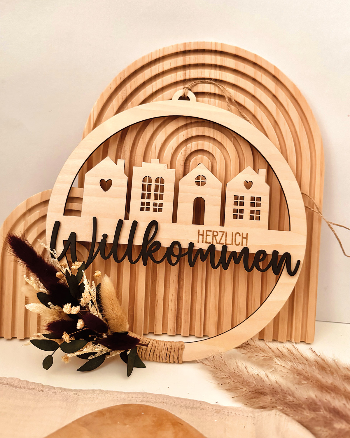 Das besondere Highlight: Das Wort „Willkommen“ wird extra gelasert und kann so in verschiedenen Farben gestaltet werden. Das sorgt für einen besonderen Hingucker. Du kannst den Türkranz individuell gestalten, indem du ihn mit Trockenblumen, Bändern oder saisonaler Dekoration verschönerst. So passt er sich jeder Jahreszeit an – ob frühlingshaft bunt, sommerlich leicht, herbstlich warm oder festlich im Winter.